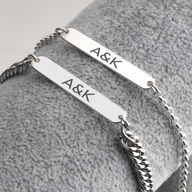 אם אתם מחפשים מתנות ליום האהבה עבור אשתכם, החברה או החבר שלכם, סט צמיד זוגי זה הוא המתנה המושלמת. סט זה מכיל שני צמידים, אחד בשבילך ואחד לבן הזוג שלך. אחד מגיע עם שרשרת רולו עדינה, בעוד שהשני מגיע עם שרשרת גורמט עבה מפלדת אל-חלד שמתאימה יותר לגברים. שני הצמידים כוללים פלטה שטוחה עם פינות מעוגלות, כששני ראשי התיבות שלכם חרוטים בכתב שחור.