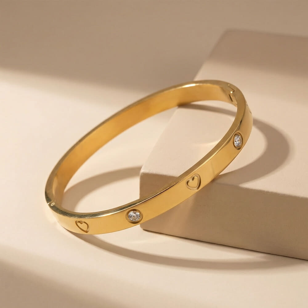 צמיד קשיח עדין ואלגנטי בעיצוב יוקרתי, משובץ אבנים נוצצות ומשולב עם חריטות לב עדינות ליצירת מראה רומנטי ומיוחד. הצמיד עשוי מפלדת אל חלד איכותית, עמידה לאורך זמן ושומרת על הברק גם בשימוש יומיומי.