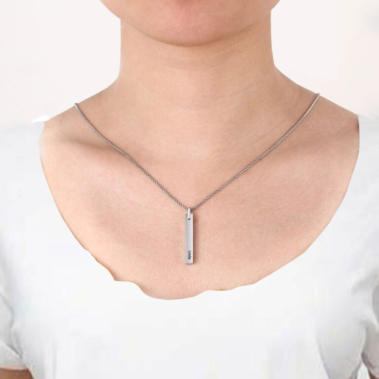 אתם מוכנים להתאהב בשרשרת בר תלת מימדית שלנו? שרשרת בר מכסף סטיינלס סטיל איכותי איכותית ביותר, עם ארבע צדדים לחריטה אישית של שמות, סמלים וכל מה שתחפצו לחרוט עליה. שרשרת בר כסף זו עם שמות ילדים, או עם מילים משמעותיות על צד אחד עד ארבעה, הופכת לשרשרת שם מושלמת. תליון עם חריטה בהתאמה אישית בצורת קובייה עם עד ארבעה שמות או מילים. התליון החרוט תלוי עם ציר על שרשרת בוקס עבה עם נכחות ועדיין בעלת מראה נשי ועדין.