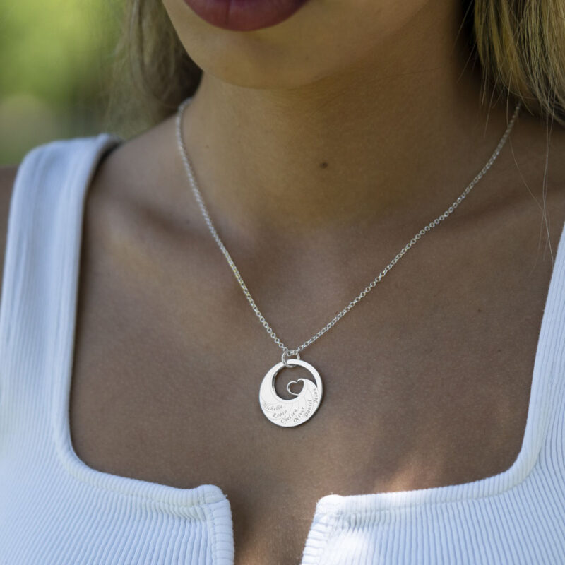 היזכר באהבתך הנצחית בעזרת שרשרת עם הלב של אמא עם שמות הילדים חרוטים בהתאמה אישית לבחירתכם. תליון עגול ייחודי ואלגנטי זה עם לב חתוך באמצע, בעל אפשרות חריטה של עד שישה שמות לבחירתכם, בנים ובנות או נכדים.